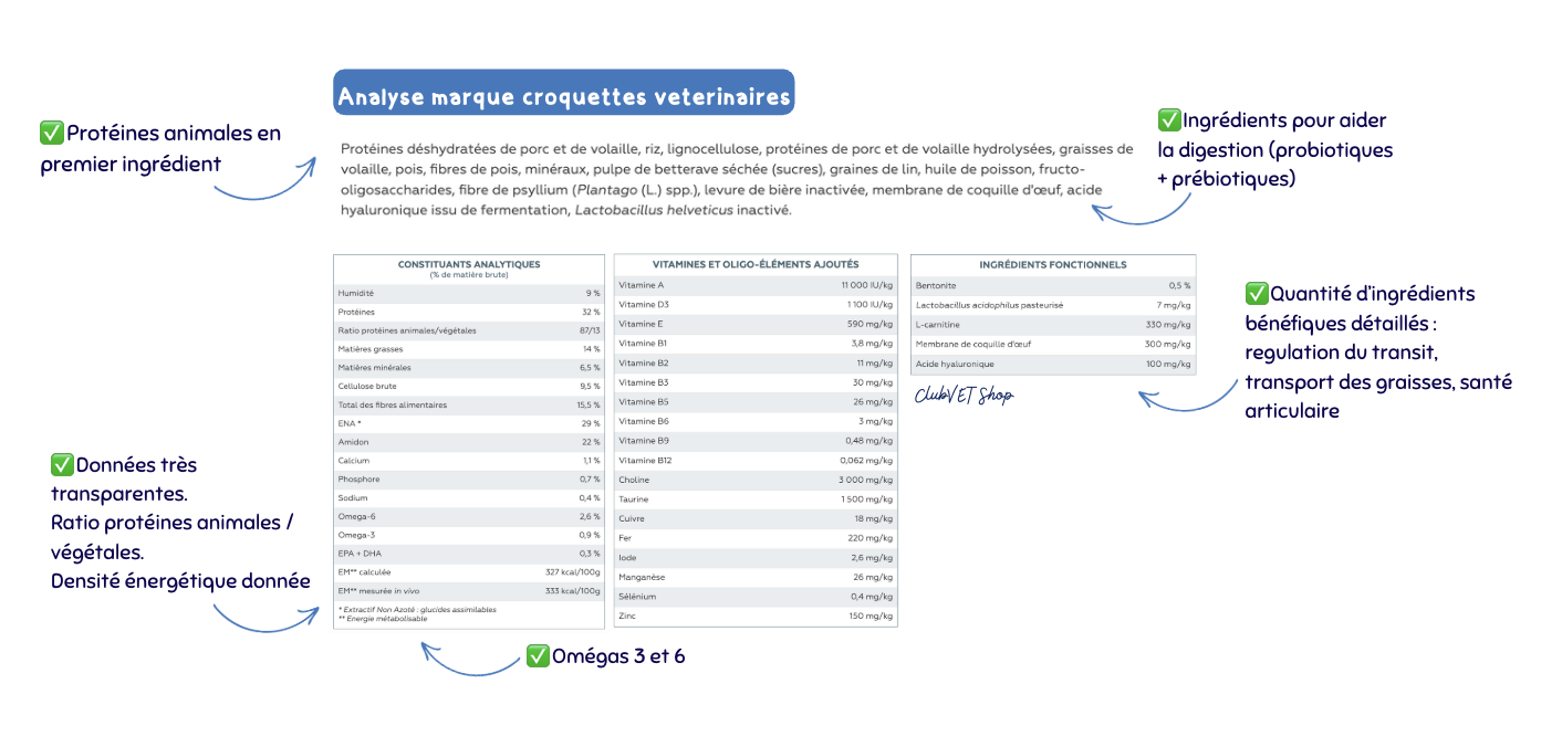 • Faible personnalisation selon les pathologies, l’âge ou la race. Les formules sont souvent très similaires même si le marketing vend un produit pour un âge spécifique.